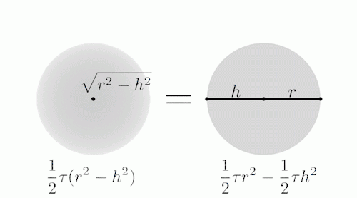 就这样,球体的体积等是圆柱与两个圆锥的体积之差: