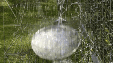 不过Howe的雕塑并不需要强风,风速只需要能吹动树叶就能够让整个雕塑系统运转起来。虽然下面这副作品摆动的很骚气,但从背后的叶子不难看出风速并不大。