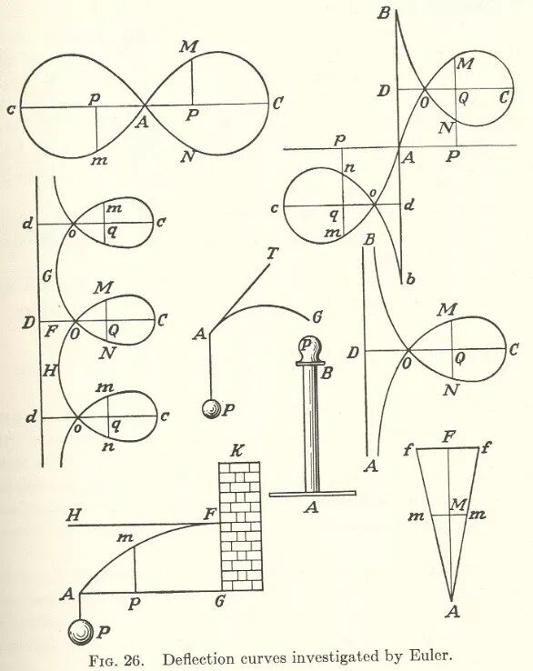 还值得一提的是欧拉(Leonhard Euler)。欧拉是瑞士的数学家和物理学家,他被一些数学史学者称为历史上最伟大的数学家之一。他有一个很有趣的问题——欧拉弹性问题(Euler's elastica),就是说一根弹性的杆子,如果被压缩的时候就会由直变弯,中间还会弯上好几次。他发现这个问题要求解一个微分方程,欧拉找到了其中的解,这个方程的解就叫做Euler's elastica。欧拉一生写了几千篇论文,其中有许多都是经典之作。