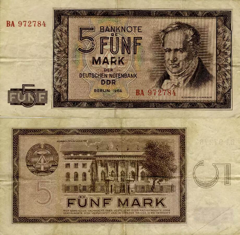 亚历山大•冯•洪堡的头像曾短暂出现在1964年版的5马克东德钞票上。1975年东德马克改版,该面值的头像也由洪堡变为托马斯•闵采尔(德国宗教改革先驱和农民起义领袖)。