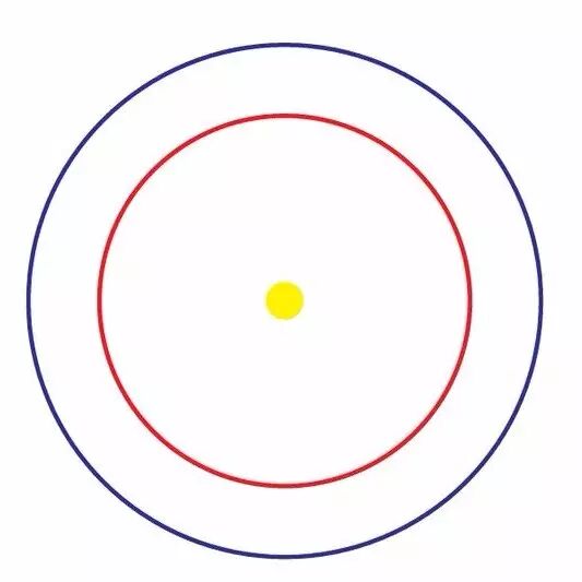 我们知道行星以近似圆形的椭圆绕太阳旋转,行星的轨道看起来就像是几个同心圆,而太阳就在圆心(椭圆焦点)附近。部分太阳系看起来就是这样的: