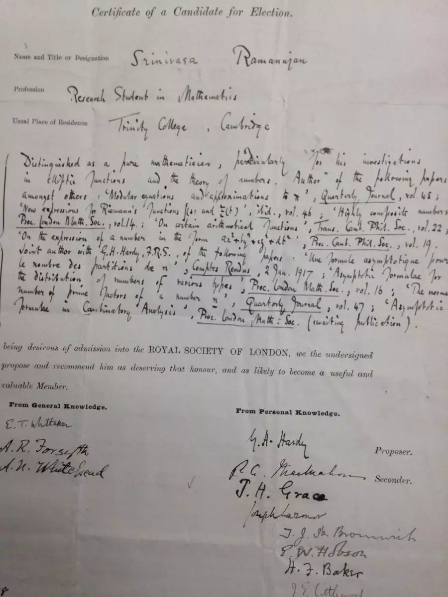1910年,拉马努金有机会认识了印度数学学会的创始人V. Ramaswamy Aiyer。他向Aiyer展示了自己数学笔记,Aiyer被拉马努金的天赋所震撼,他将拉马努金介绍给了当时印度的一些数学家。