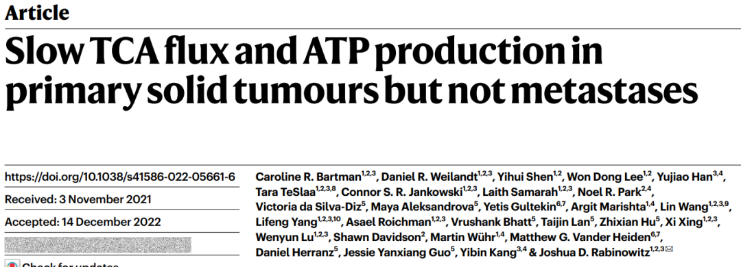 参考资料:[1] Rabinowitz: cancerous tumors are sluggardly … And thrifty. Retrieved February 2, 2023 from https://chemistry.princeton.edu/news/[2] Slow TCA flux and ATP production in primary solid tumours but not metastases. Nature (2023). DOI: https://doi.org/10.1038/s41586-022-05661-6