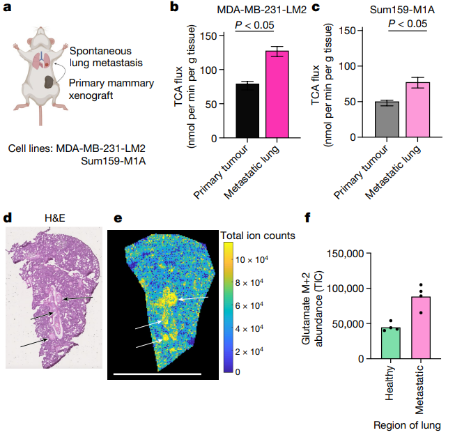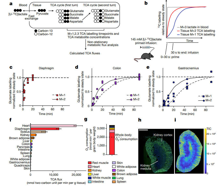 为了一探究竟,研究者设计了特殊的示踪剂,并注射到了小鼠体内,这样可以追踪细胞从环境中吸收营养物质再进入TCA的速率。其中,多种实体瘤还有转移瘤组织样本都被进行了比较。