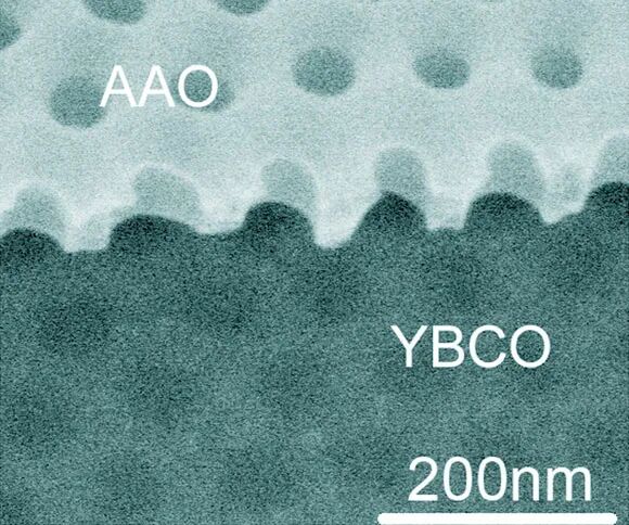 纳米图案化的YBCO薄膜的扫描电子显微镜图像。12纳米厚的纳米图案化的YBCO薄膜是利用直接放置在YBCO上面的阳极氧化铝(AAO)膜通过反应离子刻蚀制造的。通过应离子刻蚀,直径约70纳米、周期约103纳米的三角孔阵列的AAO图案被复制到了YBCO薄膜上。| 图片来源:Yang et al. / Nature (2021)