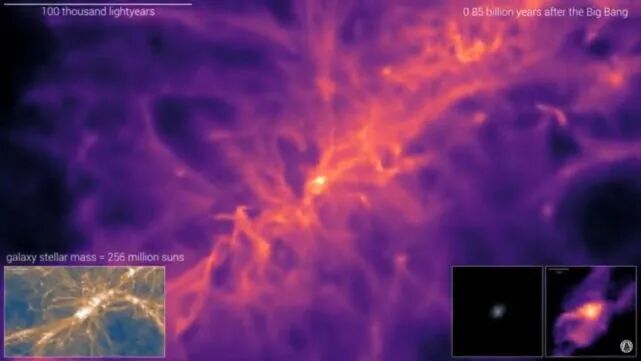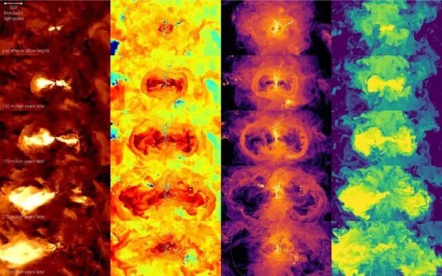 在宇宙晚期,从星系流出的物质以两种球果的形式出现,它们以相反的方向出现——就像把两个冰淇淋球果首尾相连,星系在中心打转。当这些物质试图离开银河系不可见或暗物质光环的引力阱时,它们的流动速度会减慢,最终会停止并后退,形成一个循环气体的星系喷泉。这一过程将气体从星系中心重新分配到其外围,进一步加速了星系自身向薄圆盘的转变:星系结构塑造了星系喷泉,反之亦然。创建TNG50的科学家团队(位于加兴和海德堡的马普研究所、哈佛大学、麻省理工学院和计算天体物理中心(CCA))将最终向整个天文学社区和公众发布所有的模拟数据。