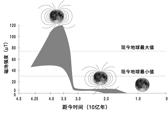 月岩显示的月球磁场历史变化示意图。| 图片来源:Green, J. et al./Science Advances