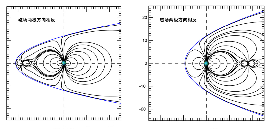 模拟结果(磁场两极方向相反)的简化示意图。太阳风从左向右移动,地月耦合磁层提供了一种强大的缓冲。| 图片来源:Green, J. et al./Science Advances(图片有简略,原图可查阅论文)