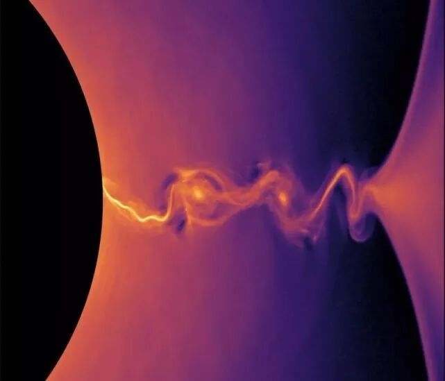 (博科园图示)来自超级计算机模拟的可视化显示了正电子在旋转黑洞视界附近的行为。图片:Kyle Parfrey et al./Berkeley Lab