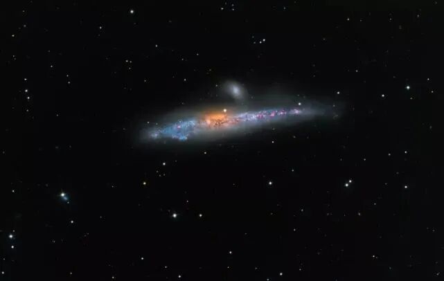 建立这样的图片可以回答一些重要问题,比如星系是如何获得磁场的,以及是否所有这些磁场都是由发电机效应产生。这些星系晕场能否照亮所观察到更大星系间磁场的神秘起源?“鲸鱼星系”(NGC4631)距离地球2500万光年,位于猎犬座,直径约8万光年,比我们的银河系略小。是由著名英国天文学家威廉·赫歇尔爵士于1787年发现的。这张图片还显示了一个伴星NGC4627,一个小的椭圆星系,就在鲸鱼星系”的上方。