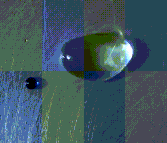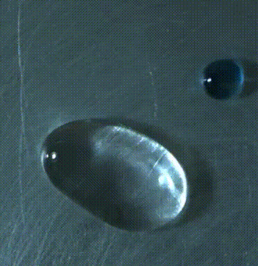 在温度为250℃的金属表面,乙醇液滴在水滴周围反复弹跳,最终合并。| 动图来源:Pacheco-Vázquez et al., PRL, 2021