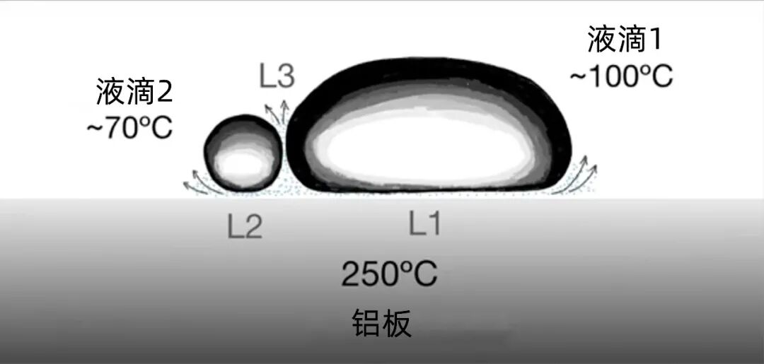 在足够热的表面上,两个液滴将会漂浮在蒸汽层(L1和L2)上。新的实验表明,当两种不同液体的沸点相差很大时,它们之间也可以形成蒸汽层(L3)。| 图片来源:Pacheco-Vázquez et al., PRL, 2021