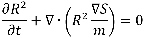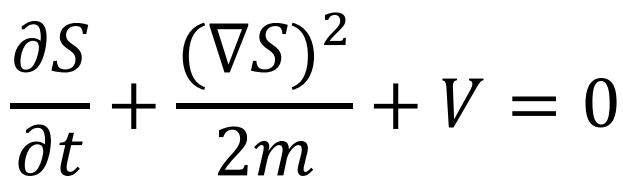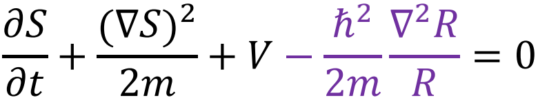 第二个等式非常直观,▽S是动量,▽S/m 就是粒子的运动速度,整个式子就是R2这个量的守恒流方程。第一个等式则比较有趣,容易看出在宏观世界中ћ→0,这个等式就自然回归到经典力学的哈密顿-雅克比方程