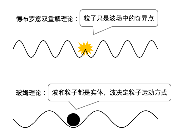 德布罗意将自己的诠释称为“双重解(double solution)”,因为它建立在同一波动方程的两种不同解之上,一种是普通的连续性解,承载着波动性,另一种是被视为粒子的奇异解,表现出粒子性。
