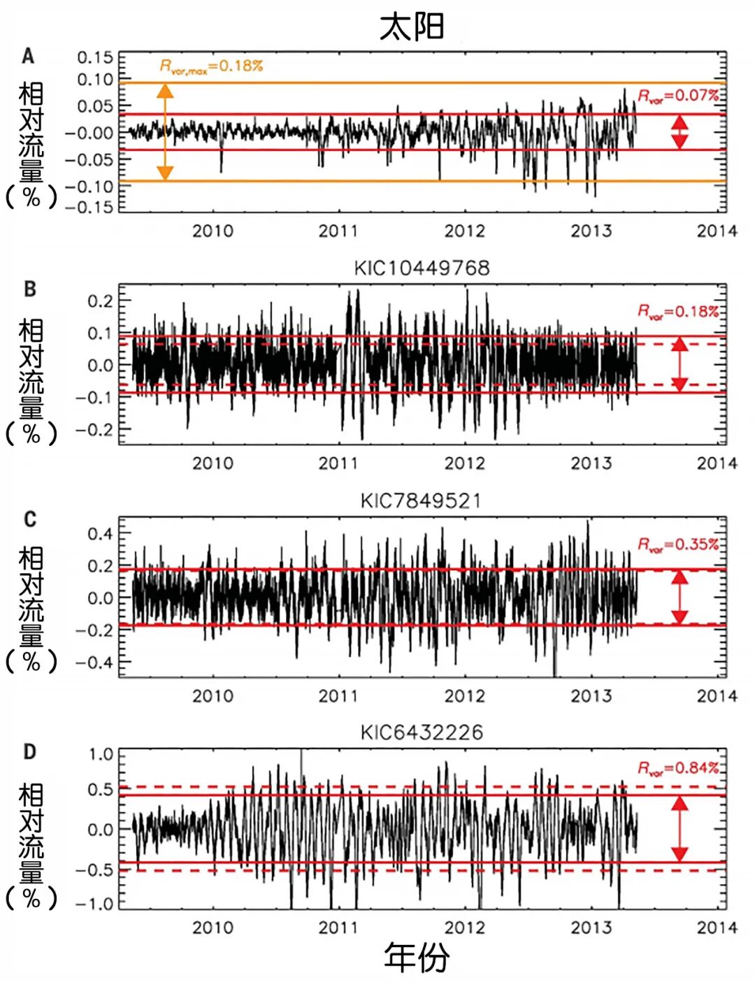 将两者对比后,天文学家发现,“类日”恒星变化的平均值约0.36%。而太阳亮度的典型变化率仅为0.07%,最多的情况也不超过0.20%。前者几乎是后者的5倍。也就是说,大多数与太阳同类型的恒星比太阳更加活跃