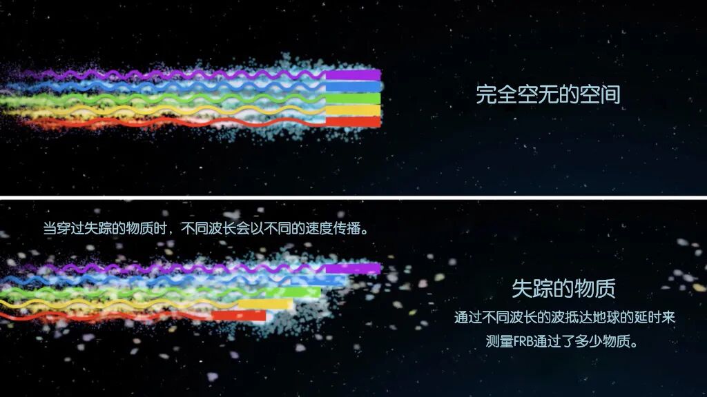 这种性质很快让研究人员意识到了FRB所具有的测量宇宙重子的潜力。通过测量一次FRB中不同波长的传播,就可以精确地计算出这些射电波在抵达地球的途中穿过了多少物质,也就是多少重子。