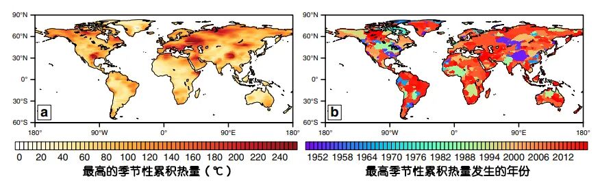 最高的季节性累积热量温度(a)与其发生的年份(b)。| 图片来源:[3]