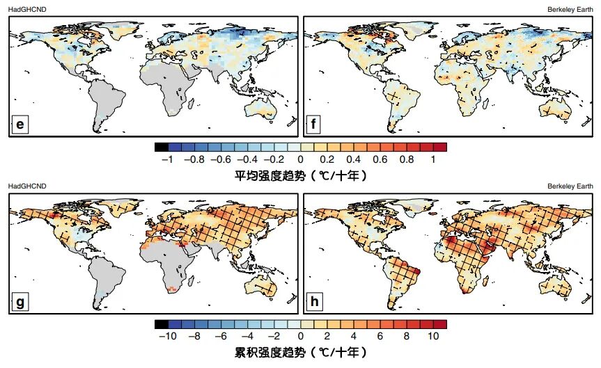 热浪平均强度的趋势(e&f)以及累积强度的趋势(g&h)。左图来自准全球观测数据库HadGHCND在1950年-2014年的数据,右图来自全球观测数据库Berkeley Earth在1950年-2014年的数据。| 图片来源:[3]