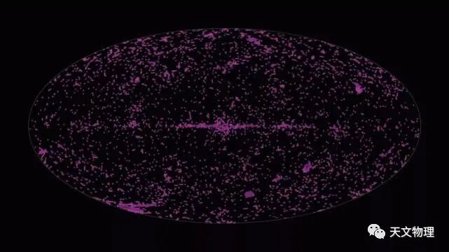 与前一份3XMM-DR7目录相比,该目录包含了532个观测值和47363个探测值。虽然天空中光源的模式可能是随机出现,但在这里可以看到一些结构。椭圆代表天球,一个抽象的视角,对宇宙的观察就是在这个视角上投射出来。这些数据是在星系坐标中绘制,这样图的中心就与银河系的中心相对应——这可以在图中看到。穿过椭圆的中心是一条水平线,紫色的斑块似乎在这里聚集在一起。