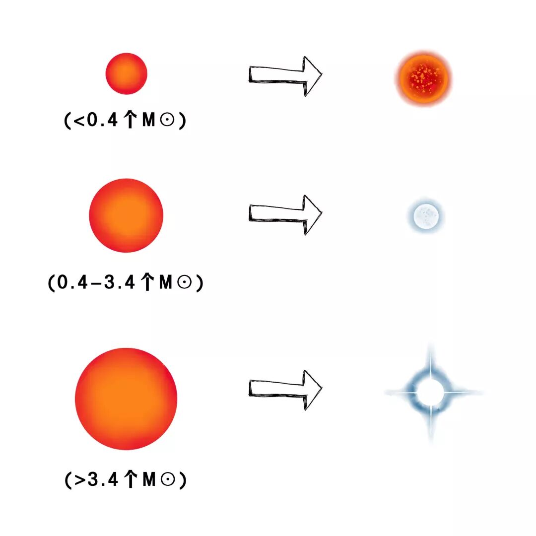 ❶小于0.4个太阳质量的恒星,耗尽核心的氢之后,不会产生大的变化,最后变成红矮星; ❷在0.4-3.4个太阳质量之间的恒星,当核心的氢耗尽之后产生坍缩,内核会形成小而密的白矮星;