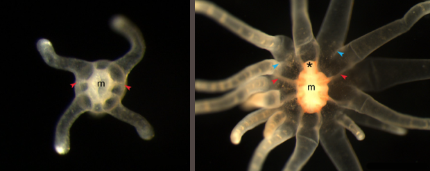 在观察星状海葵的触手的发育过程中,研究人员注意到,星状海葵的成虫阶段的触手的发育过程,是有别于最初的四个触手的。于是,他们从肌肉细胞中识别出了负责最初的4个触手生长的基因。接着,他们将这种基因移除,创造出了缺乏该种基因的星状海葵。他们发现,被移除了关键基因的星状海葵,只能完好地长出前4个触手,但是却无法再长出更多的触手,无论吃得再好
