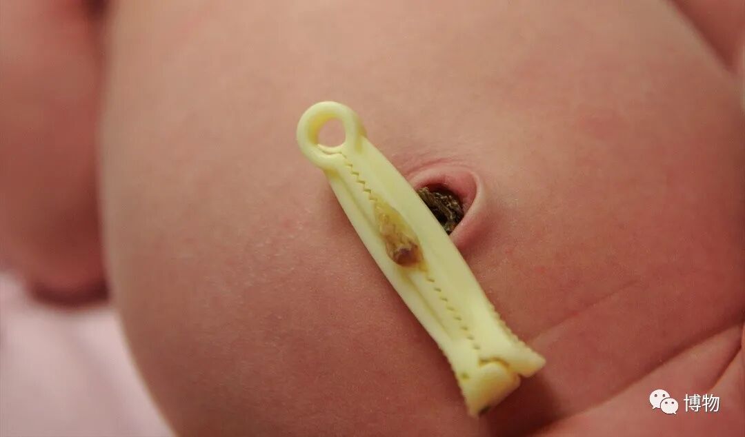 还有,现在也有脐带剪断后不打结的,而是用夹子封口。过几天残存的脐带就会脱落,婴儿腹部连接脐带的孔洞,则逐渐封死并长出新的皮肤,成为肚脐。