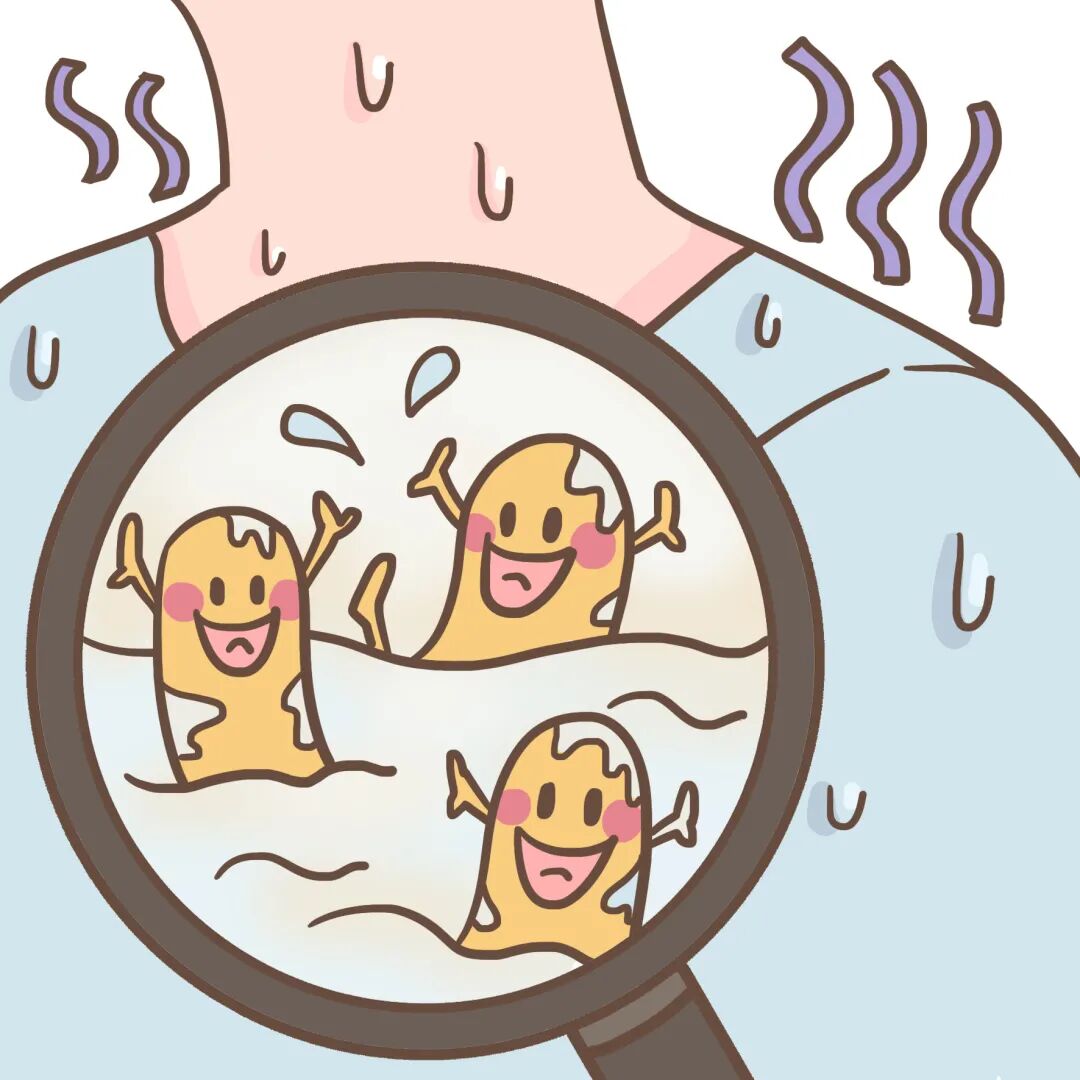 但是当我们出完一身汗,还不肯去洗澡的时候,这些乳酸菌就开始大量繁殖,让衣服闻起来臭臭的。还会跟类白喉杆菌、葡萄球菌等共同捣蛋,造成人体的腋臭和汗臭等。