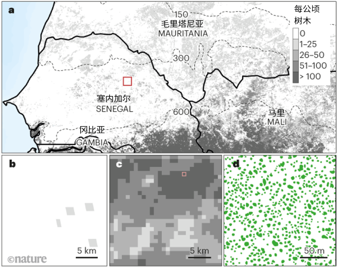 关于树木分布的准确信息能为生态学研究提供有用洞察,但要获取较大面积土地的这类数据存在挑战。a,此前一项研究[2]基于实地样地数据(图中为西非的数据样本)估算了全球每公顷的树木密度。a图中的方块内是一片干旱地区(年均降雨量少于600毫米),对应图b。虚线显示为年均降雨量(单位为毫米)边界。c,d,Brandt等人[1]利用一种能分析高分辨率卫星图像的人工智能方法,鉴定了西非地区的单个树冠。作者在非洲旱地发现的树木密度高于此前研究结果。比如,Brandt等人对a图中方块的对应地区进行了分析,得到了c图显示的每公顷树木密度。他们还鉴定了每个树冠(绿色)的大小和位置,如d图所示,对应c图中的方块地区。此前研究并未提供这种细节的树木信息。(上图根据参考文献[1]和[2]制作。)(施普林格·自然对于出版地图中的管辖权声明持中立态度。)