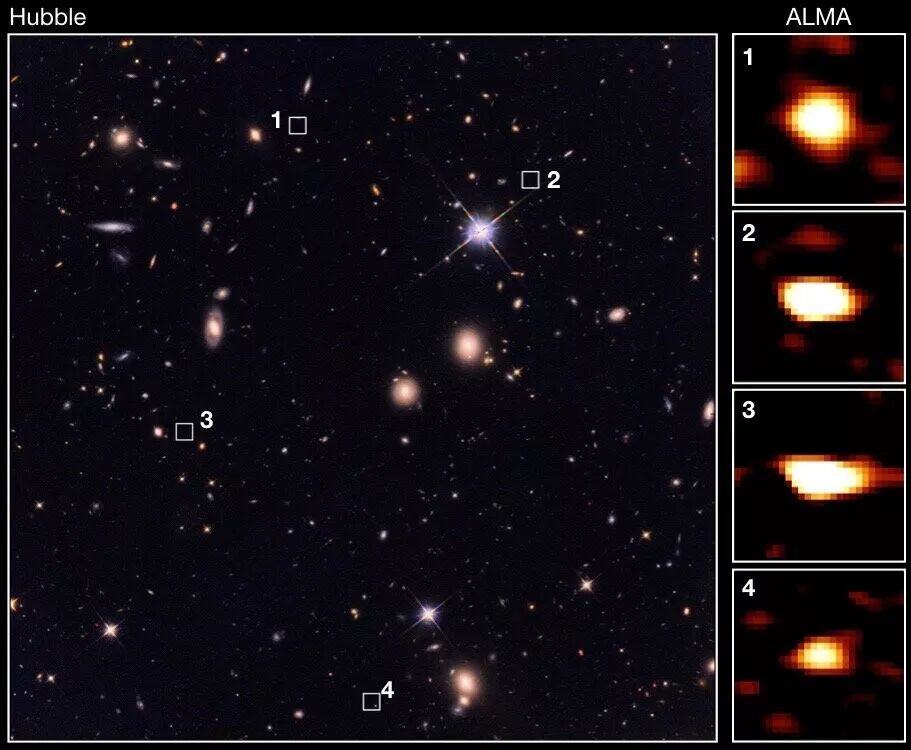 他们利用ALMA在较长的远红外光波下对每一个候选星系进行了分析研究,最终证实了39个候选星系。通过与之前已经拍摄的照片对比,他们也证实了哈勃望远镜是看不到这些古老星系的,因此,他们将这些星系归类为“H-dropout”,意思是“被哈勃遗漏的信号”。