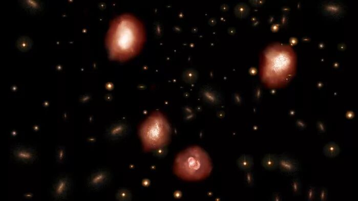 最近,宇宙演化史上的一个巨大空白终于被天文学家填补上了。利用多台望远镜,他们惊喜地发现了一个隐藏的大型星系群。宇宙从诞生至今已经有138亿的历史,而这些大型星系却在118亿年之前就已经存在了。这是天文学家第一次证实,在宇宙生命周期的头20亿年时间里有如此庞大的星系群,它们的存在与超大质量黑洞暗物质的分布密切相关。