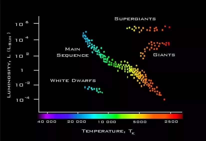 ○ 恒星分类:纵轴代表恒星的光度,横轴代表温度。其中大部分恒星都属于主序星(main sequence)。| 图片来源:UF StarFleet Wikipedia