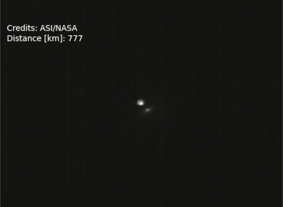 立方星LICIACube逐渐靠近又远离两颗小行星的画面,下方的是孪小星,距双星系统最近时距离仅有56.7公里 | ASI/NASA [2]