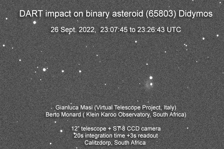 撞击时刻是UTC时间2022年09月26日23:14,动图持续时间是23:07-23:26共19分钟,溅射物在大约23:19开始出现 | Gianluca Masi (Virtual Telescope), Berto Monard (Klein Karoo Observatory) [8]