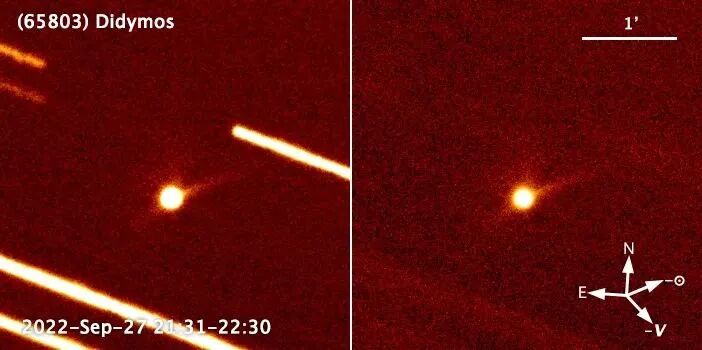 撞击两天后,位于智利的SOAR望远镜拍摄到:孪小星附近飞出的撞击溅射物微弱了不少,但还没有完全消散。一条超过9600千米长的“尾巴”已然形成,这是一部分溅射出的尘埃被太阳辐射压力“推动”产生的,类似彗星的“尾巴”。