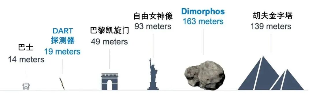 DART探测器和小行星Dimorphos示意图的大小对比 | 改编自NASA/Johns Hopkins APL [2]