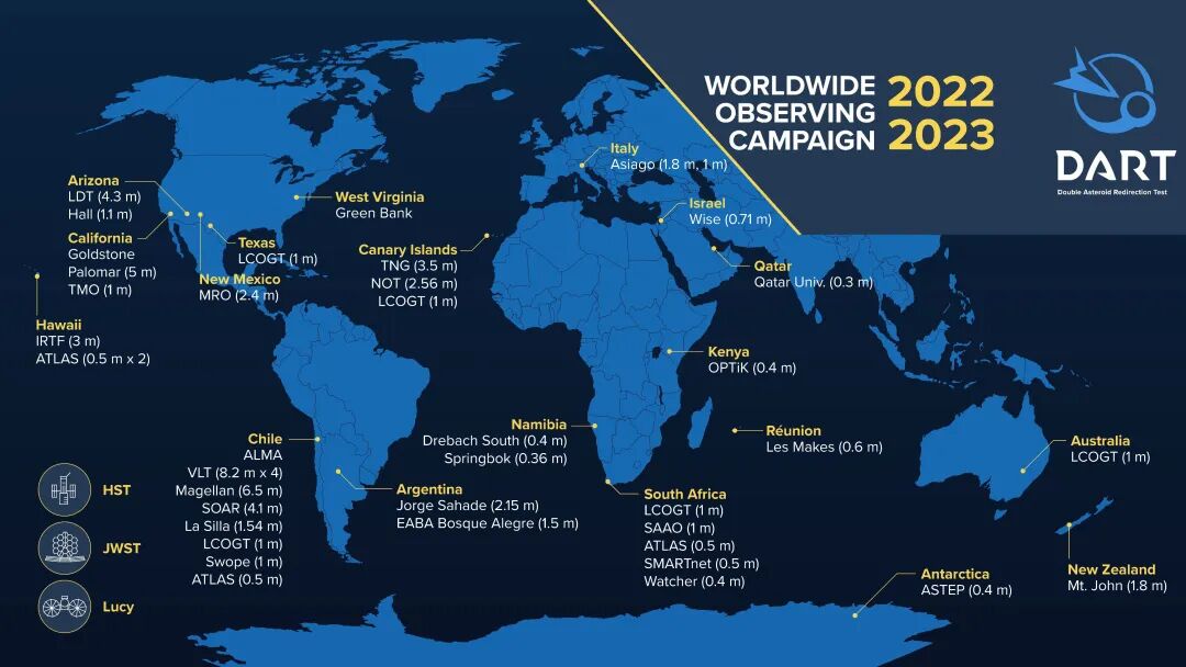 计划开展孪小星撞后观测的地基和空间望远镜分布,当然,有些最终没有成功拍到 | Johns Hopkins University Applied Physics Lab