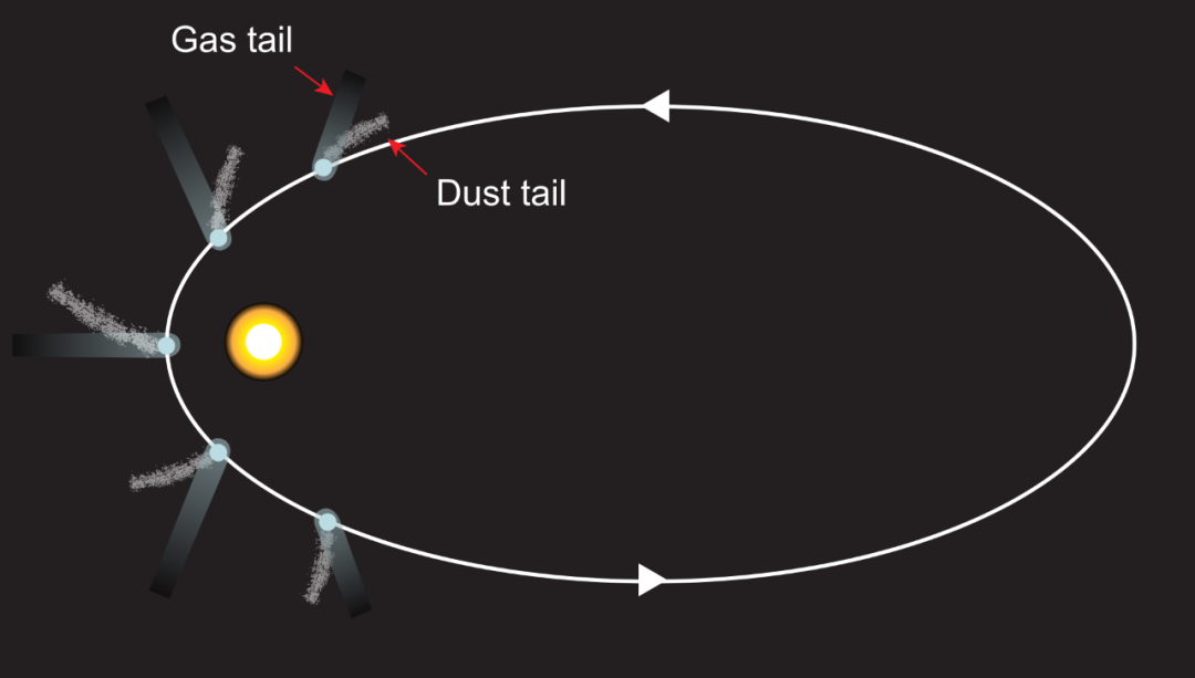 彗星在飞到太阳附近的时候,彗核中被低温封印住的挥发物和尘埃会被太阳唤醒,生出云团一般的彗发和长长的彗尾。彗尾也常常分叉成两条:一条是太阳风推动彗发中的气体和等离子形成的“气体尾”(gas tail),也叫“离子尾”(ion tail),出现在背向太阳的方向;另一条是太阳辐射压力推动彗发中的尘埃颗粒形成的“尘埃尾”(dust tail),大体出现在彗星飞行轨迹的后方和离子尾之间。