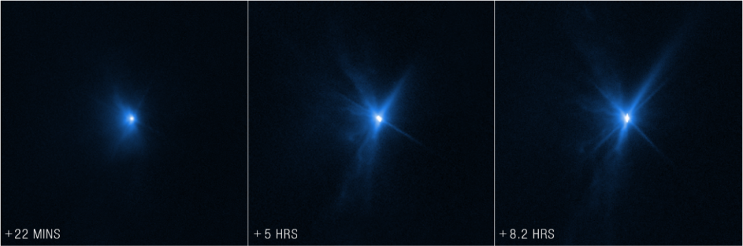 哈勃空间望远镜拍摄的孪小星被撞后22分钟(左)、5小时(中)和8.2小时(右)后溅射物的变化,左侧为DART航天器的撞击方向 | NASA, ESA, 李荐扬 (PSI), Alyssa Pagan (STScI) [13]