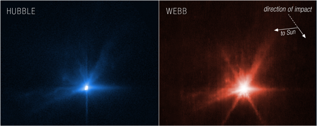 但相比于地基望远镜,更惊艳的还得看NASA的空间望远镜双壁:哈勃和詹姆斯‧韦布。撞击后的几个小时里,两台空间望远镜分别拍摄到了双星系统在可见光和红外波段的照片,撞击飞溅出的物质明亮耀眼。这也是两大望远镜首次同时观测太空中的同一个目标。