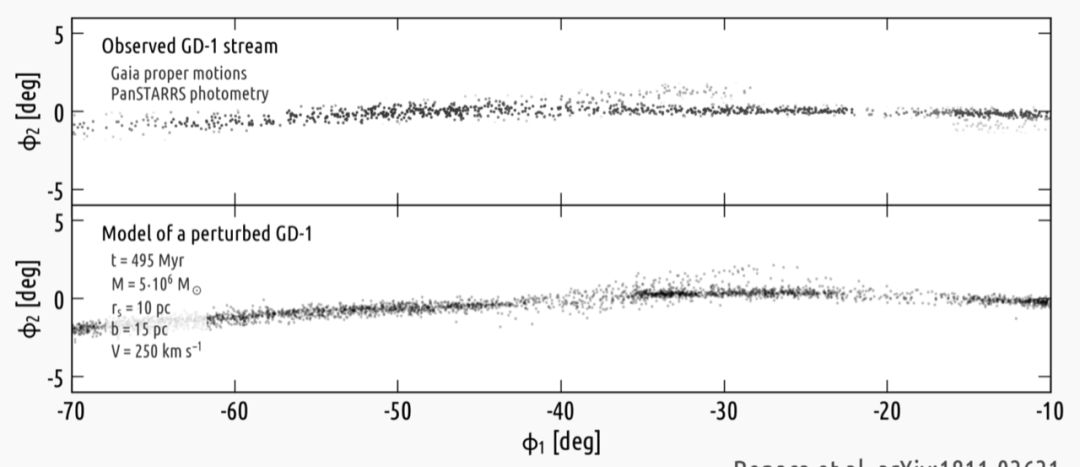 4月15日,Bonaca在美国物理学会(APS)会议上展示了她所发现的证据:一系列存在于银河系的最长星流GD-1上的破洞。星流是一连串围绕星系运动的恒星,它们曾经可能是一个球状星团或者矮星系,在星系(比如在这里是银河系)引力的巨大潮汐作用下,沿着两个方向被撕裂、拉伸形成了星流。GD-1中的恒星就是在很久以前坠入银河系的“球状星团”的残余,它们在天空中伸展开来,形成一条长长的线。