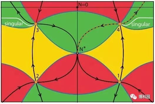 (博科园-图示)橙色虚线表示,描述宇宙随时间变化状态的路径积分只经过一个鞍点,鞍点是稳定的。