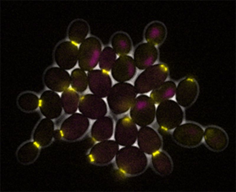 ○ 酵母细胞的生长和分裂:控制细胞分裂的机制与某种蛋白质(明亮区域)的浓度有关。| 图片来源:K. Schmoller / 斯坦福大学