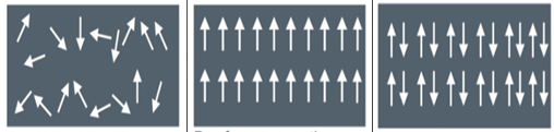 虽然安培的分子电流假说能够比较直观地解释一些物理现象,但是也存在着很大的局限性。随着量子理论的发展,人们对磁性的认识才逐渐地深入,现在大家一般认为物质的磁性是来源于原子磁矩。原子磁矩之间是存在着相互作用的,这种相互作用可以使原子磁矩排列成不同的方式,从而产生了顺磁、铁磁、反铁磁等不同的性质。这种相互作用是一种量子效应,根据不同的理论模型,又可以分为海森堡交换作用、双交换作用、超交换作用以及RKKY交换作用等,用来解释不同磁体中磁性的起源。