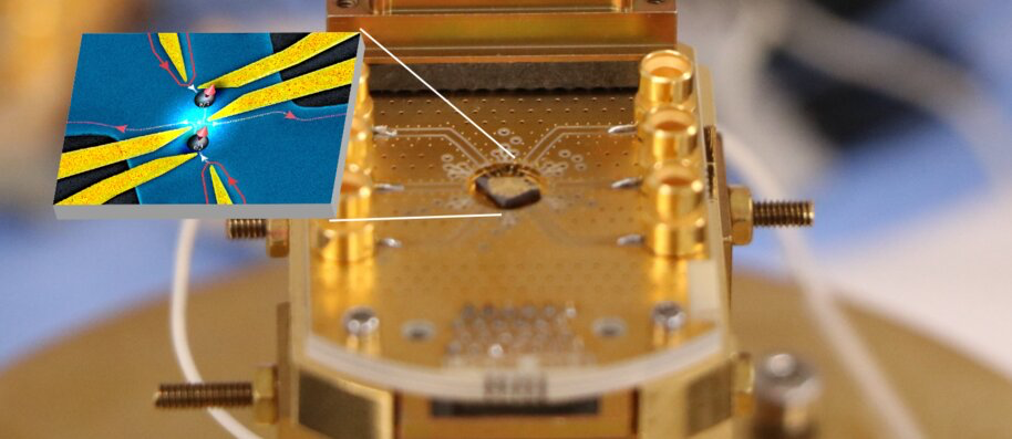○ 从微型对撞机(如彩色扫描电子显微镜图像所示)获得的任意子存在的证据。任意子沿着由电极(黄色)决定的路径移动。两个任意子(蓝色球体)在中心处碰撞,从两边退出。| 图片来源:Manohar Kumar