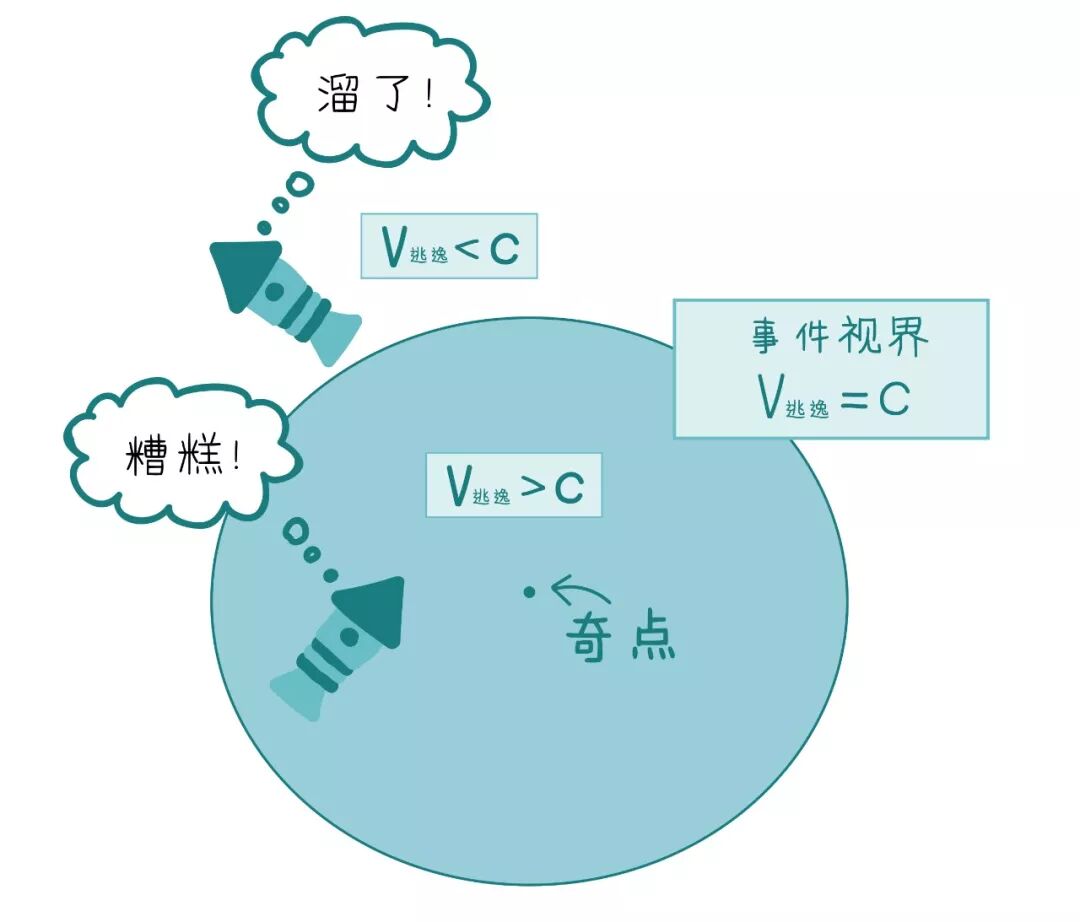 ○ 黑洞的引力是如此的强大,以至于连光进入到它的掌控范围都无法逃脱。黑洞的基本结构包括了隐藏在一个事件视界内的奇点。在事件视界内,逃逸速度(V逃逸)超过了光速(c),因此一旦物体落入就永远被困住了。