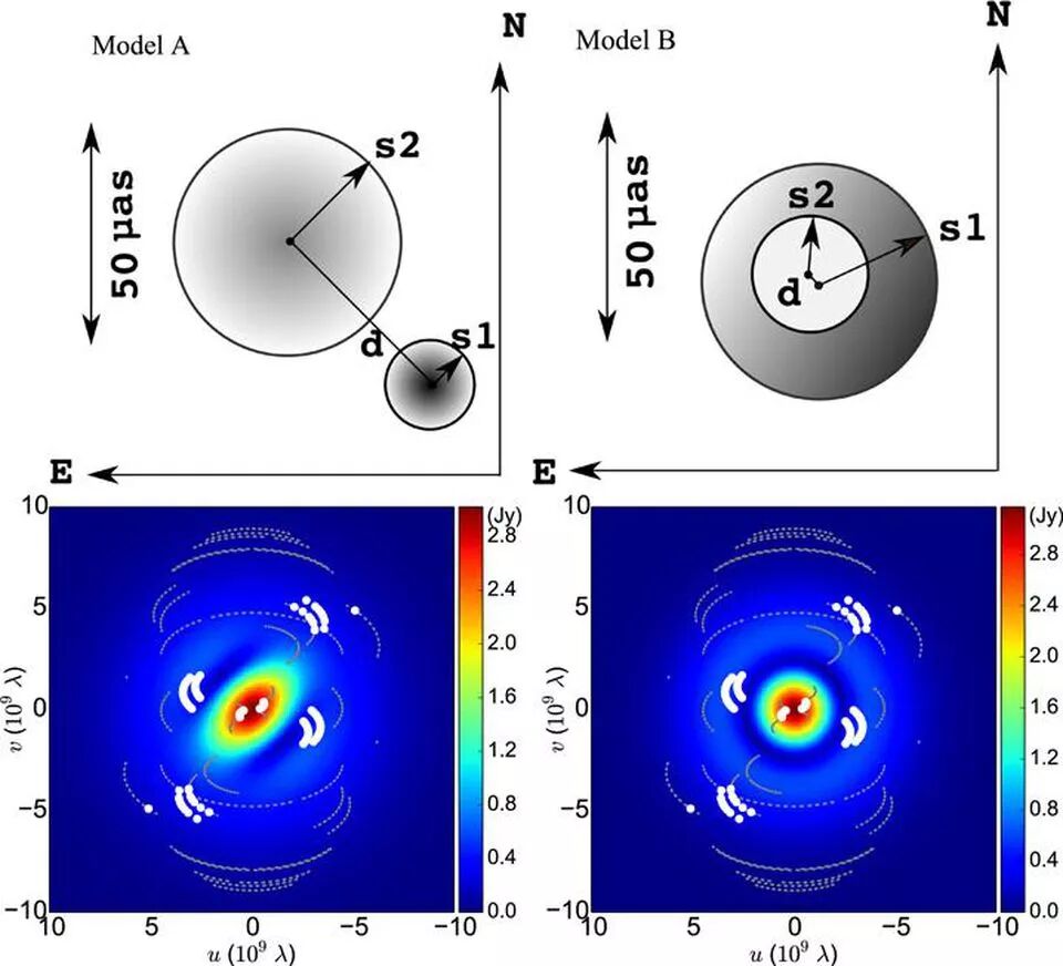 ○ 到2018年初为止,可以成功地适用于视界望远镜的数据的两种模型。两种模型都显示出一个偏离中心的、不对称的视界,相比于史瓦西半径是扩大了的,这与爱因斯坦广义相对论的预测一致。完整的图像还没有向公众公布。| 图片来源:R.-S. LU ET AL, APJ 859, 1
