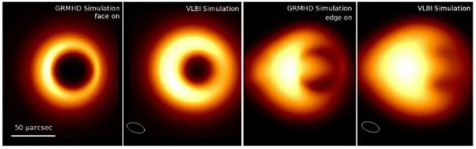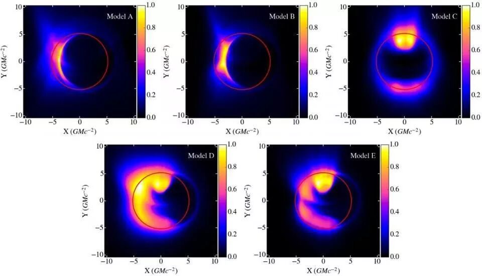 ○ 使用黑洞吸积盘的磁流体动力学模型,以及由此产生的射电信号,基于广义相对论所运行的五种不同的模拟。注意事件视界在所有预期结果中的明显特征。| 图片来源:GRMHD SIMULATIONS OF VISIBILITY AMPLITUDE VARIABILITY FOR EVENT HORIZON TELESCOPE IMAGES OF SGR A*, L. MEDEIROS ET AL., ARXIV:1601.06799