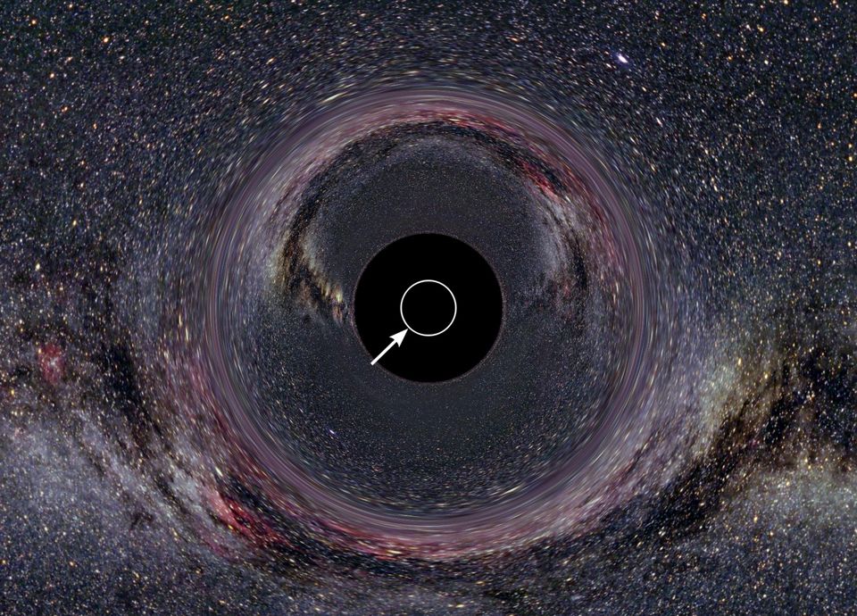 ○ 这里模拟的是银河系中心的黑洞,这是我们从地球视角能看到的最大黑洞。2019年,事件视界望远镜(Event Horizon Telescope, EHT)将首次拍摄到这颗银河系中央黑洞的事件视界的样子。白色圆圈表示黑洞的史瓦西半径。| 图片来源:UTE KRAUS, PHYSICS EDUCATION GROUP KRAUS, UNIVERSITÄT HILDESHEIM; BACKGROUND: AXEL MELLINGER
