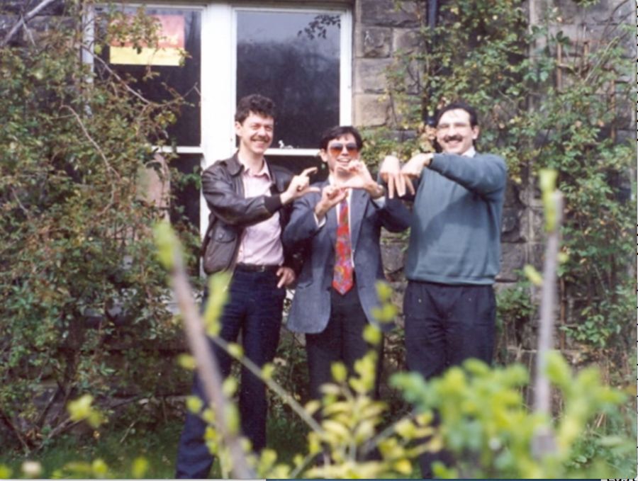 图4. Carlos Frenk, George Efstathiou, Simon White (从右到左)用手比出CDM三个字母