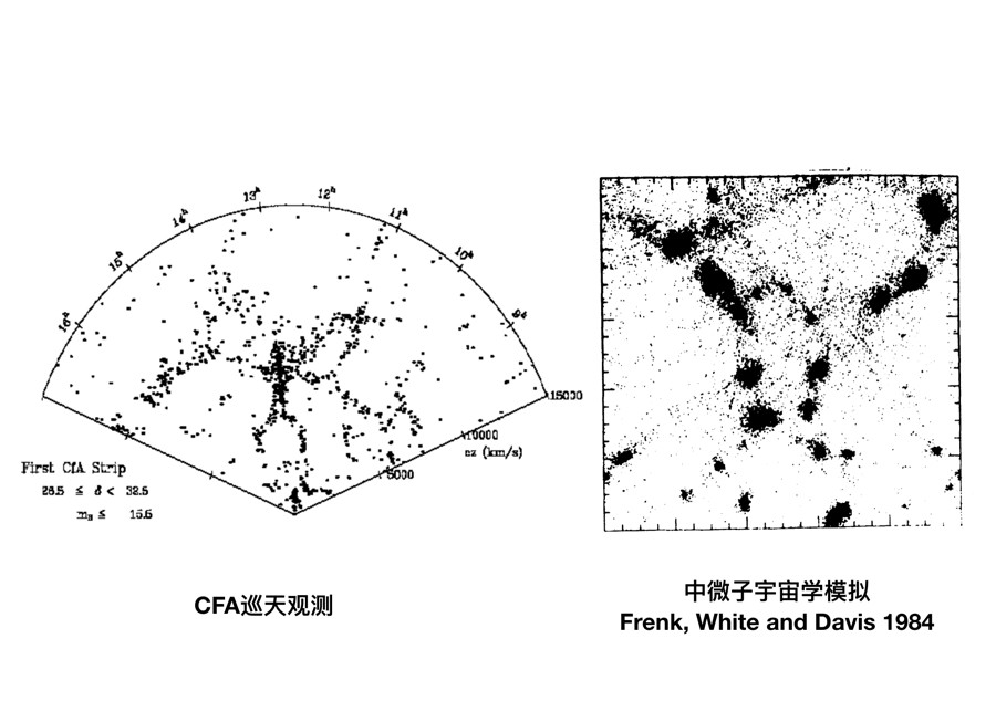 图2. 右图是1984年Carlos Frenk等人计算的热暗物质宇宙中大尺度结构形态,左图是CfA观测利用星系描绘出的宇宙大尺度结构。热暗物质宇宙中的宇宙结构看上去比真实宇宙中结构粗的多。